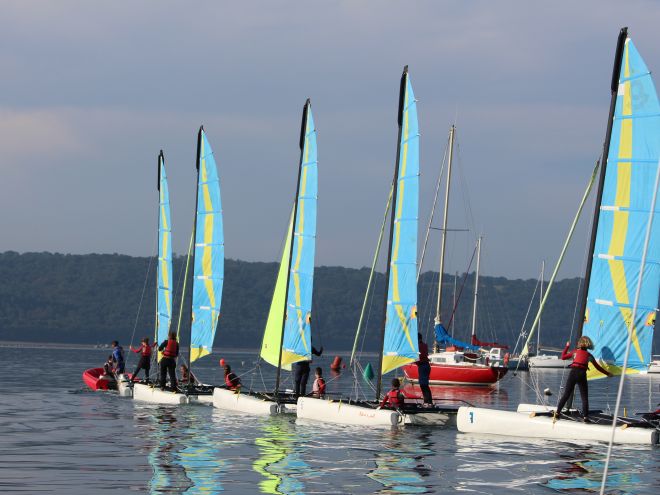 Une flottille composée de: - 30 catamarans - 50 kayaks - 12 stand up paddles et 1 paddle géant - 14 planches à voile - 1 voilier collectif (12 places) - 7 bateaux de sécurité - 1 barge motorisée (30 places)